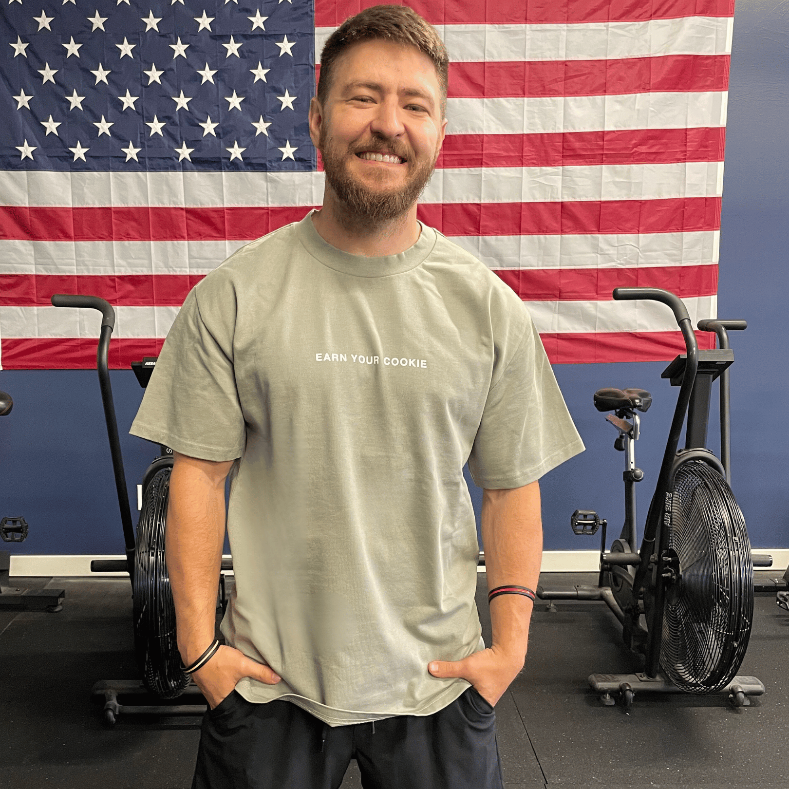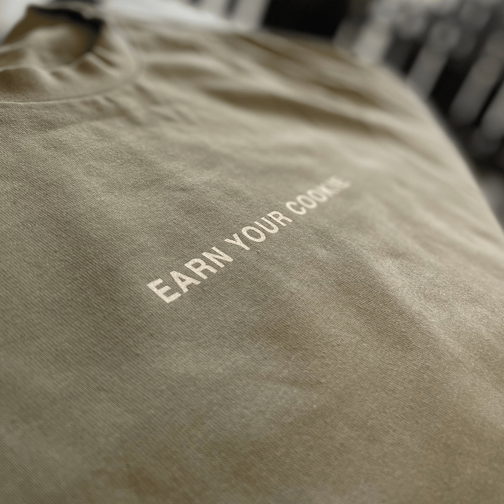 Featuring our motivational "Earn your cookie" motto proudly displayed on the front and the inspiring "No Crumb Left Behind" motto on the back, this shirt is more than just a piece of clothing—it's a statement. Whether you're pushing through a tough workout or enjoying a well-deserved break, this shirt serves as a reminder to always give it your all and savor every victory.